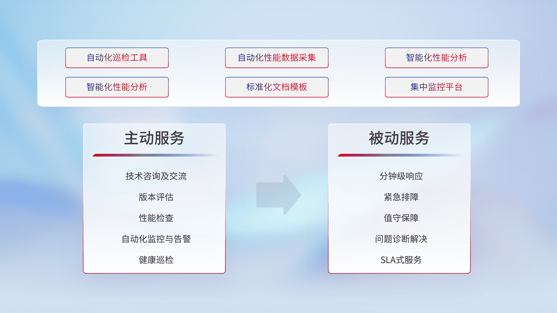 智能化工具和标准化文档,,保障服务质量,,提供主动服务(包含技术咨询、、版本评估、、、、性能检查、、、自动化监控与告警、、、健康巡检)和被动服务包含(分钟级响应、、紧急排障、、、值守保障、、、问题诊断解决、、、、SLA服务)。。。。