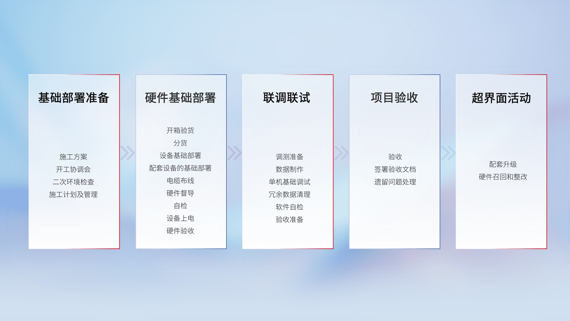 从基础部署准备、、、硬件基础部署、、联调联试、、、项目验收、、、越界面活动的全过程可追溯,,,,保证施工质量和进度。。